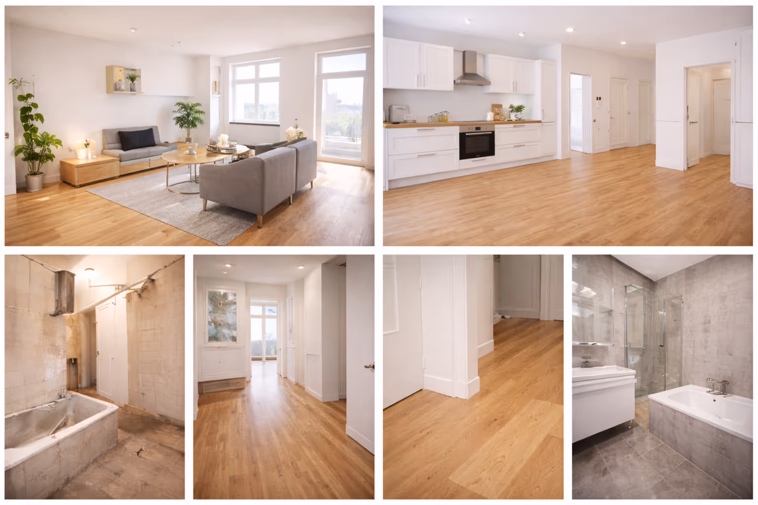 Alte Bodenbeläge, unebene Wände, veraltete Elektrik und unklare Raumaufteilung machten eine umfassende Sanierung notwendig. Ziel war eine moderne, helle Wohnung mit klaren Linien und langlebigem Finish – geeignet für Eigennutzung oder Vermietung.